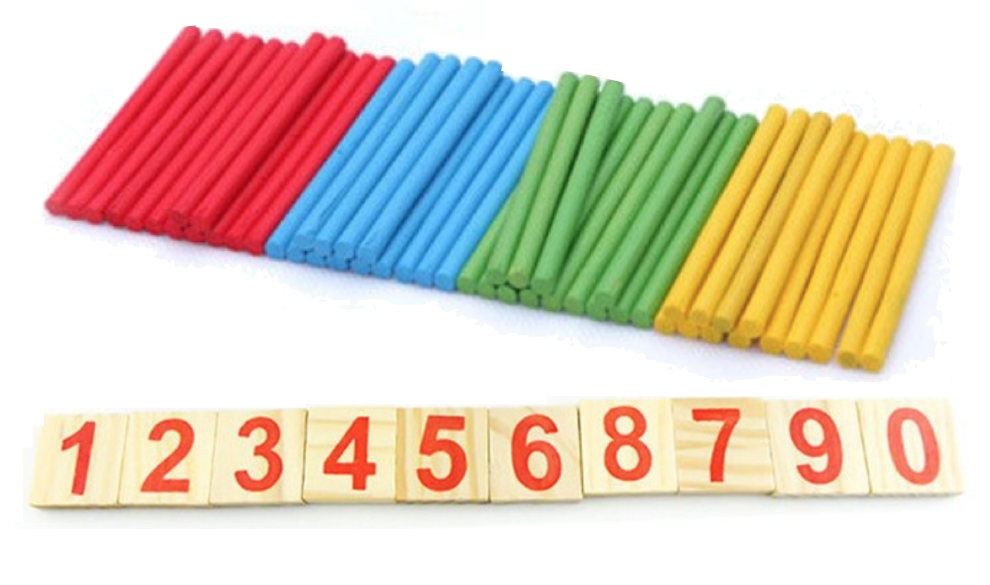 Ce coffret en bois est composé de 48 bâtons de couleurs (12 jaune, 12 rouge, 12 vert et 12 bleu) ainsi que de 24 carreaux représentant les chiffres de 0 à 9 (chaque chiffre étant en double sauf le 9) et les symboles mathématiques (addition, soustraction, multiplication, division et égal). Tous ces éléments sont en bois naturel peint avec de la peinture à l'eau non toxique.