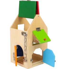 Sur la planche d'apprentissage multifonctionnelle se trouvent une variété de serrures telles que la fermeture à garrot, la chaîne de porte, le mousqueton ainsi que la serrure à moraillon, à coffre, à verrou et à cylindre avec clé. La clé et le verrou sont fixés à des bandes élastiques afin de ne pas se perdre.