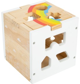 Il devra introduire dans le bon endroit les 13 éléments en bois, de différentes formes et couleurs dans le cube. Ces éléments peuvent également être utilisés en tant que blocs de construction.