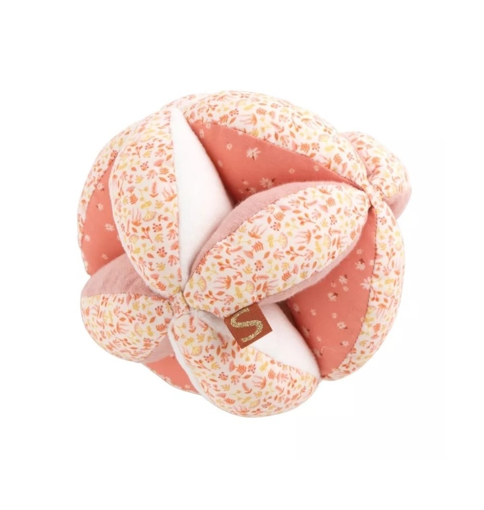Offrez à votre tout-petit un moment d’éveil tout en tendresse avec cette balle de préhension rose fleurie de la marque Sauthon.