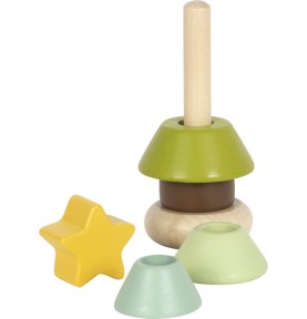 Vers 2 ans l’objectif de l’enfant sera d’empiler tous les anneaux en bois du plus grand au plus petit en terminant par la tête ou l'étoile tout en haut de la tour.